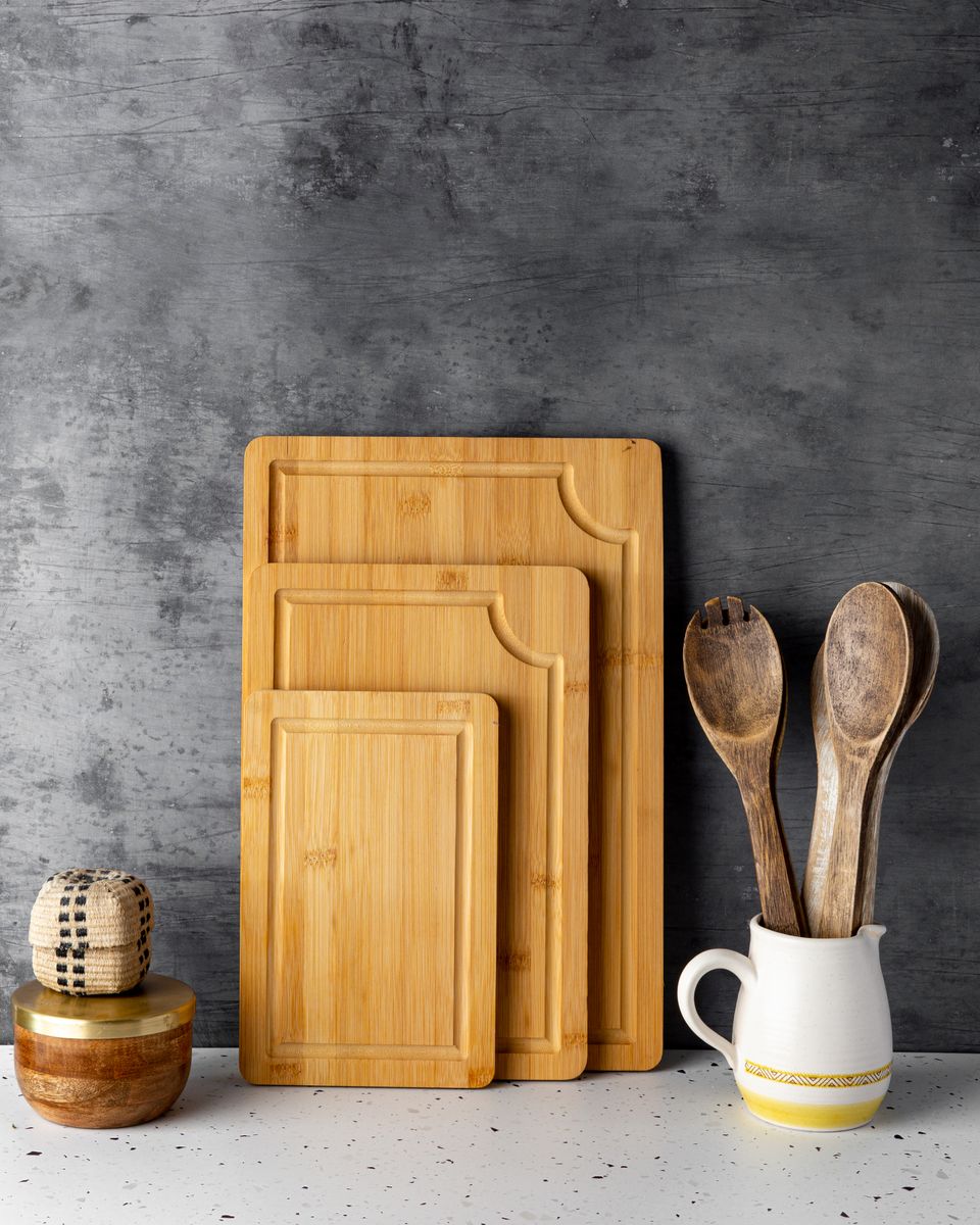 Introducing our new set of three bamboo cutting boards! These boards are perfect for any kitchen, with a juice groove to catch spills and handles on the back for easy transport. They're also made from sustainable bamboo, so you can feel good about using them.