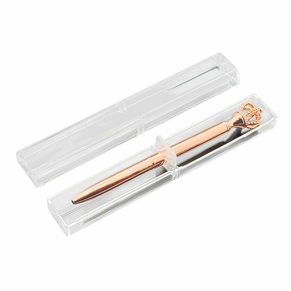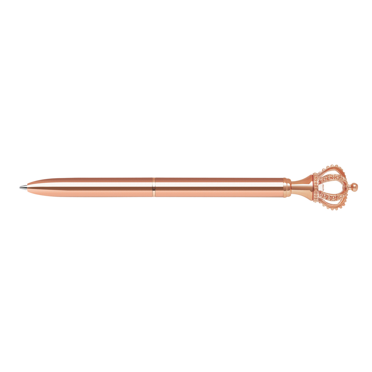 An exquisite twist-action metal ballpoint pen featuring a diamond-encrusted crown and embedded diamond dome. With a brass barrel, rose gold trims, and luxurious finish, it makes a stunning impression in any setting. (T5307)