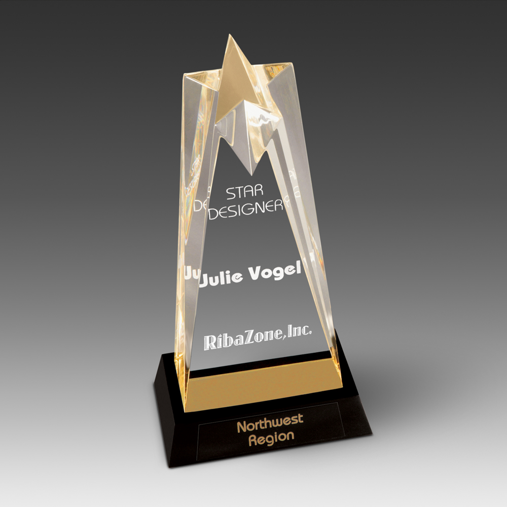 The Star Tower™ Award showcases a striking 2" thick sculptured acrylic star tower with a mirrored bottom in gold, blue or silver. It sits on a sleek black base designed to hold an optional engravable black brass plate (base sold separately). This elegant award offers a sophisticated way to honor outstanding achievements with customizable recognition. Available in three sizes (STW-AN, STW-BN, STW-CN). All dimensions approximate. Pricing includes spot print or laser engraved imprint.