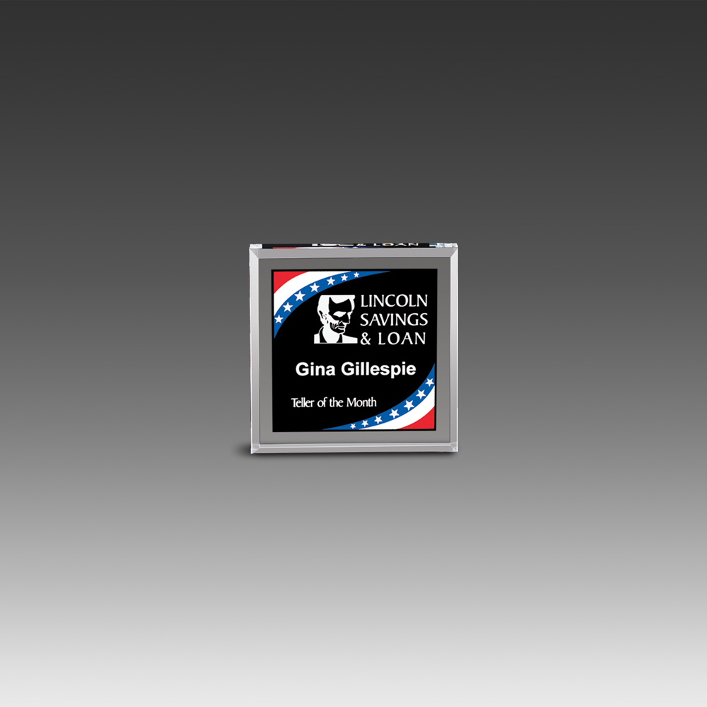 The Freedom Stars Stripes Paperweight™, part of the Freedom Awards Collection™, is a bold 3.75" square piece crafted from clear acrylic. It showcases rich red, white and blue patriotic graphic designs on the top and bottom set against a black background. Durable and eye-catching, this paperweight is both a functional desk accessory and a meaningful symbol of recognition and pride. All dimensions approximate. Pricing includes spot print or laser engraved imprint.