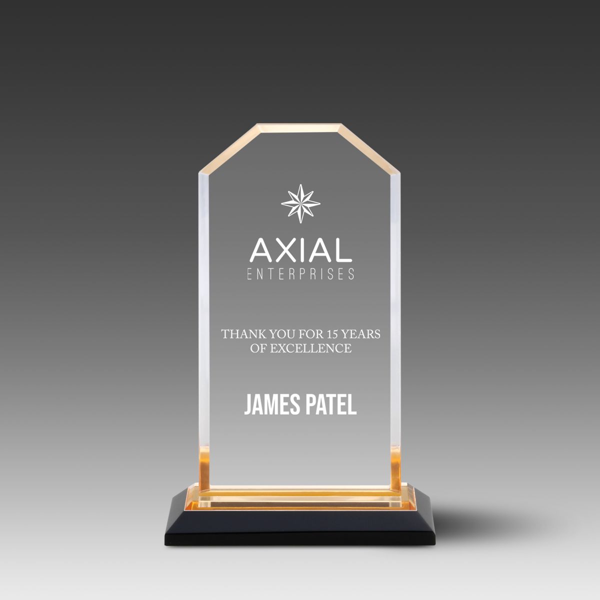 The MirrorCorners Award™ combines sleek design with eye-catching detail for a modern presentation. Crafted from 3/8" thick clear acrylic, it features clean lines and bold contrast. A reflective base in your choice of blue or gold adds a vibrant pop of color, elevating the overall look. Part of our Value Mirror Collection, this award line delivers standout recognition with smart pricing in mind. Perfect for honoring teams or groups, this award delivers style and sophistication without breaking the budget. Available in two sizes (MCO-AN, MCO-BN). Overall size includes base. All dimensions approximate. Pricing includes full-color, spot print or laser engraved imprint.