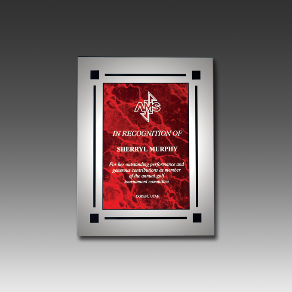 The Clearplaq™ Marble Graphic Acrylic Plaque combines classic style with modern clarity. Made from 3/8" thick acrylic, it features a rich blue, green or red marble graphic framed by a sleek black border and a clear outer edge for a modern look. The built-in Anyway™ hanger allows for easy horizontal or vertical wall display. A refined and versatile way to recognize excellence. Available in three sizes (CPQ-7N, CPQ-8N, CPQ-9N). All dimensions approximate. Pricing includes spot print or laser engraved imprint.