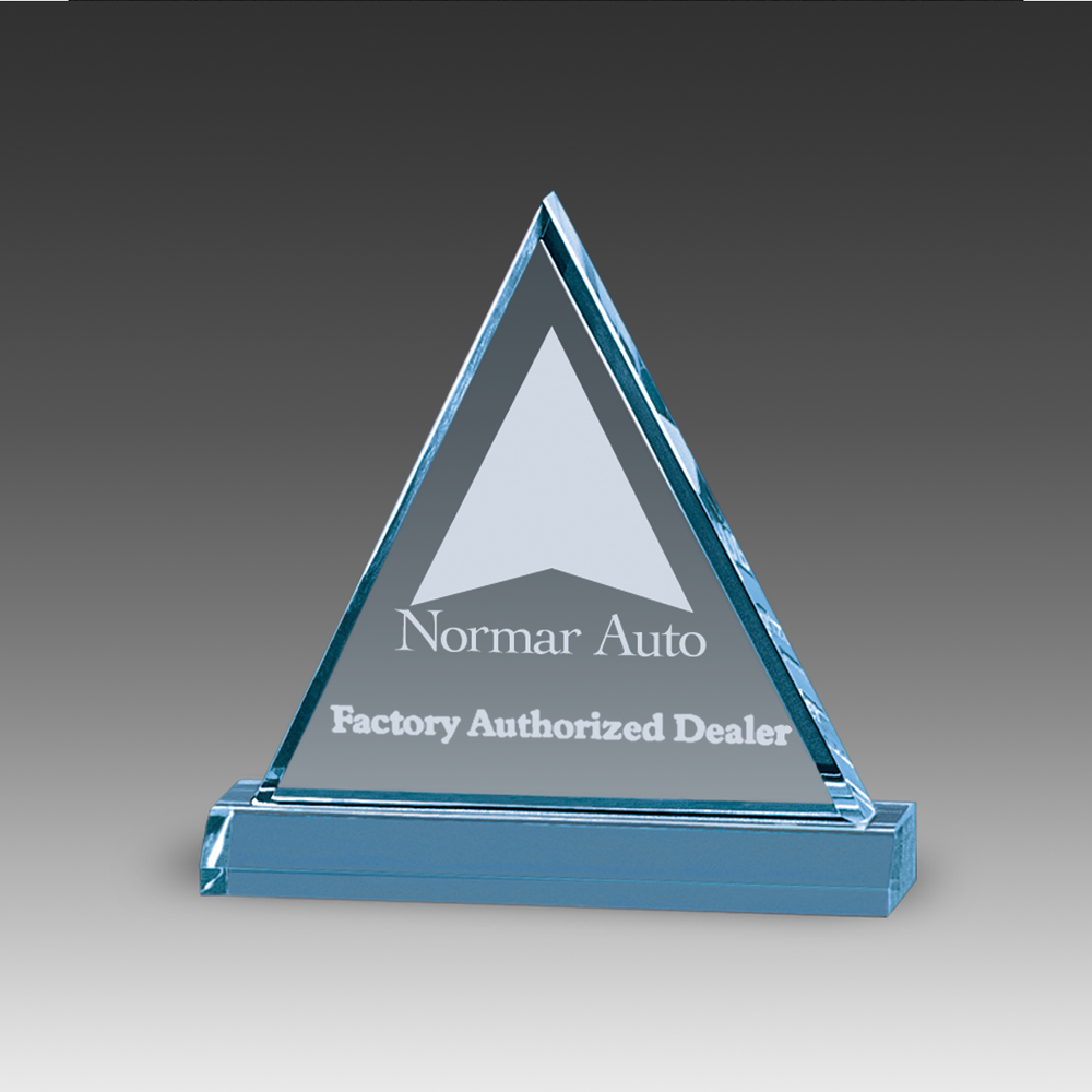 The Beveled Triangle Award features a sleek 3/4" thick acrylic design available in clear, jade green or glacier blue. Mounted on a matching rectangular base, it offers a polished and professional look. Part of our Corporate Award Collection, this award is ideal for honoring achievements with a modern, distinctive style that stands out. Available in three sizes (BTA-AN, BTA-BN, BTA-CN). Overall size includes base. All dimensions approximate. Pricing includes full-color, spot print or laser engraved imprint.